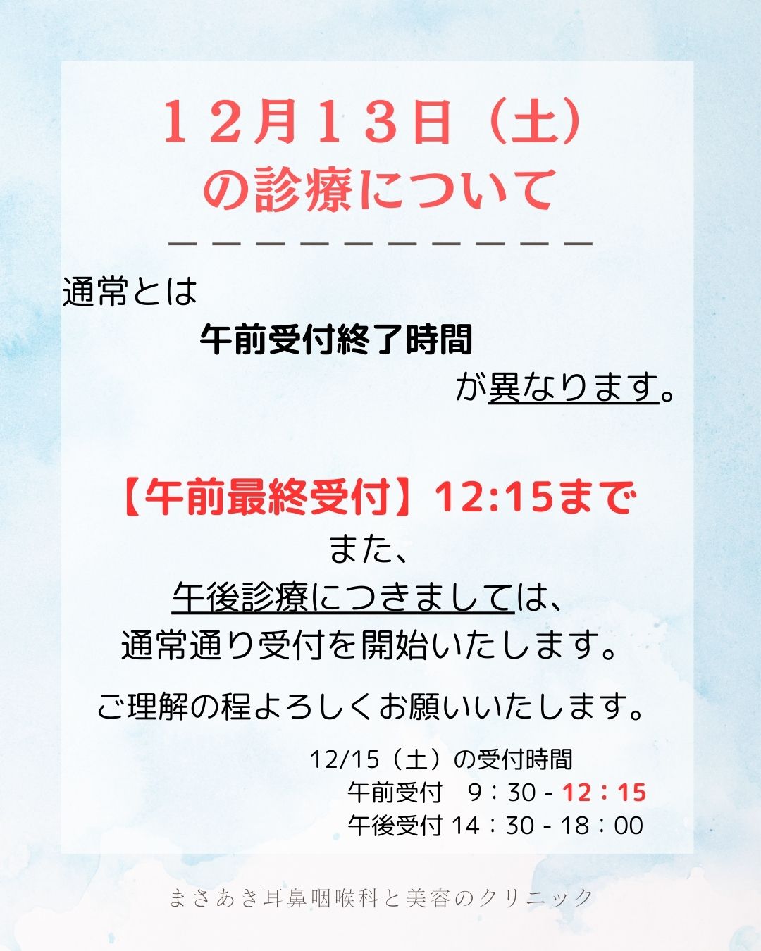 12月13日(土)は、午前診療のみ受付終了時間が通常と異なります。