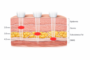 2.0mmは主に真皮深層に作用し、皮膚のハリや小ジワ改善に寄与します。3.0mmは皮下支持構造に、4.5mmはSMASに作用します。それぞれの層の役割を理解したうえで組み合わせることが重要です。
