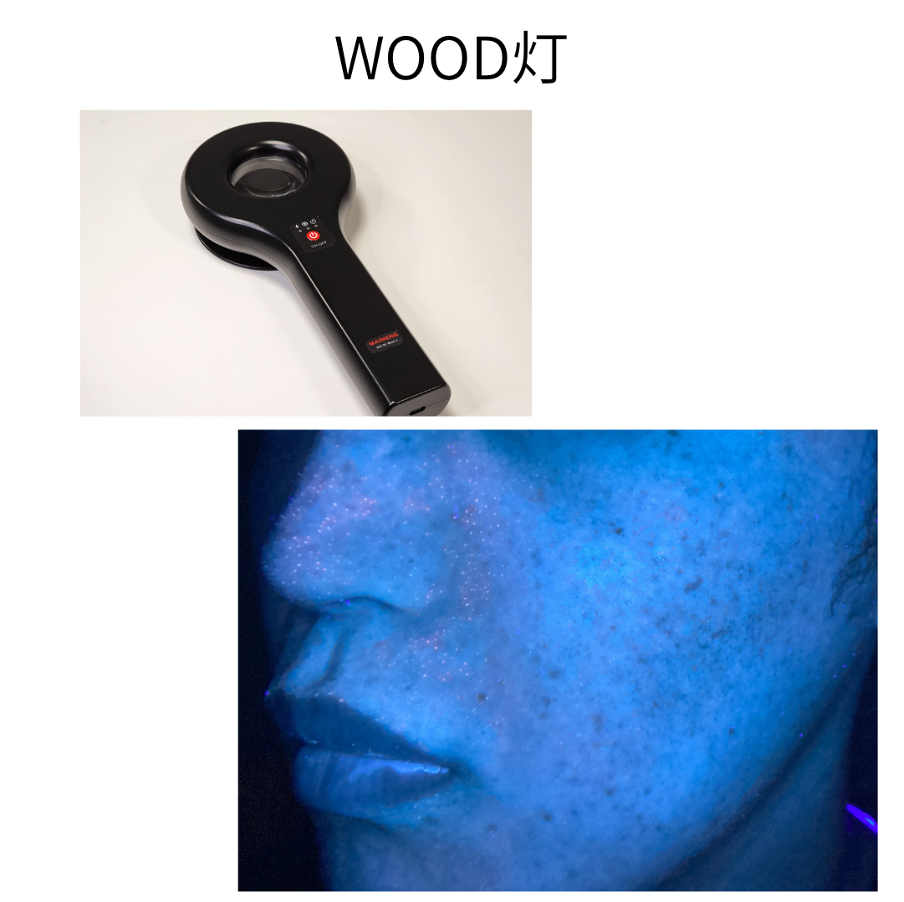 Wood灯は、特殊な紫外線を当てることで、シミの色素が皮膚のどの深さにあるかを推測する検査です。