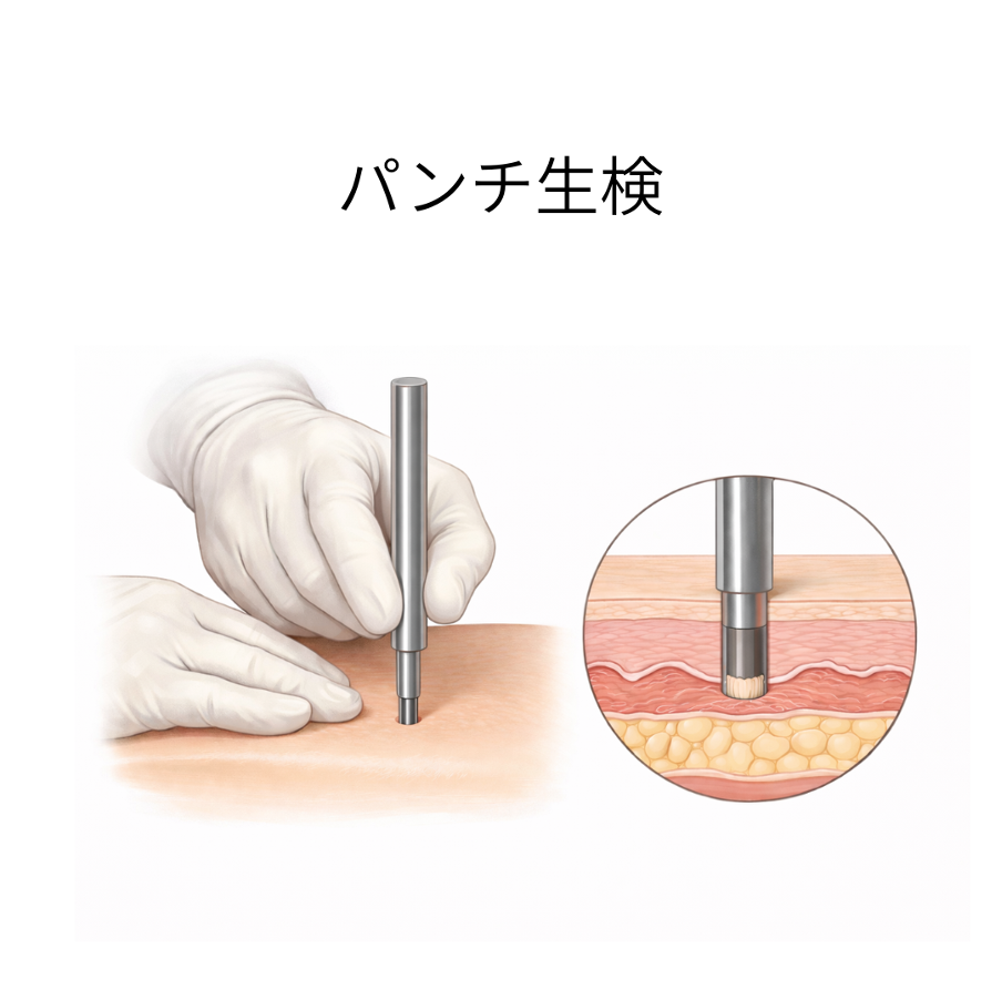 生検(せいけん)とは、皮膚の一部を少量採取し、顕微鏡で詳しく調べる検査のことです。見た目だけでは判断が難しい場合や、治療の適否を慎重に見極める必要がある場合に、診断を確かなものにするために行います。